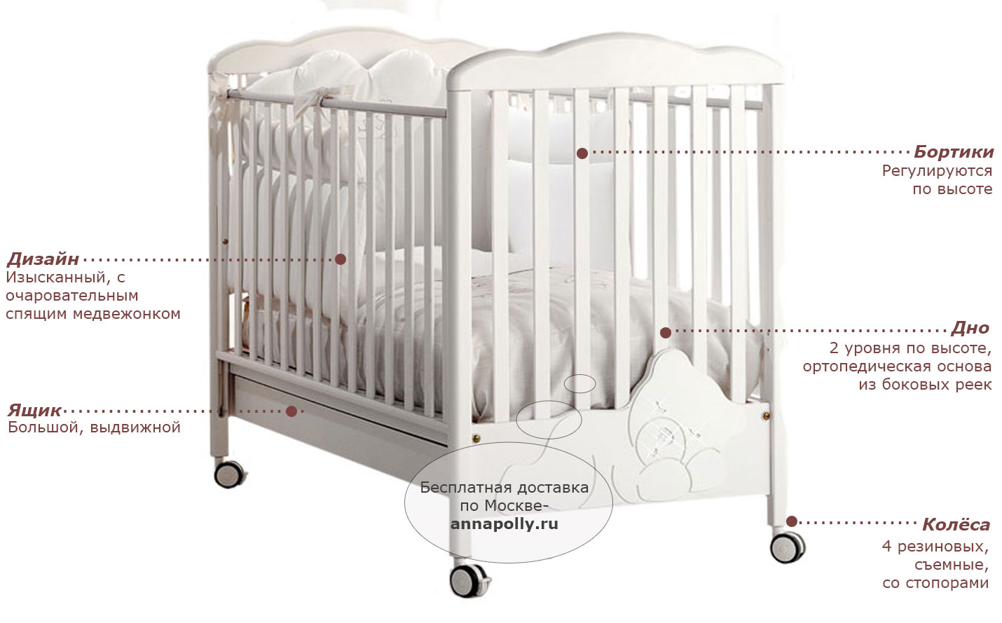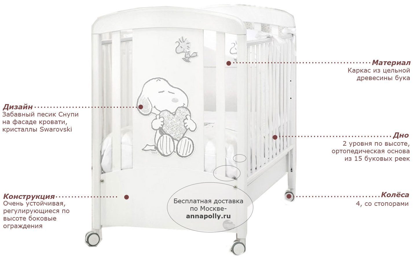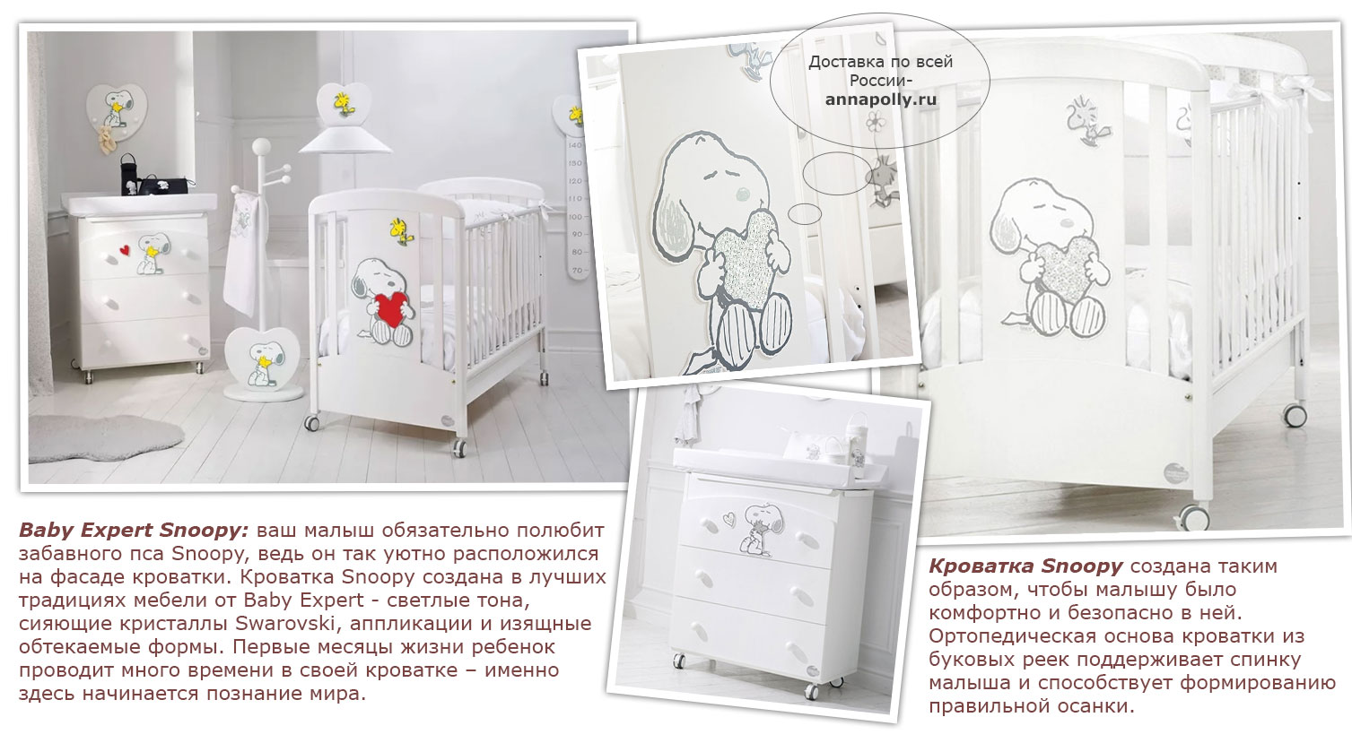 Кроватка Baby Expert Snoopy – изящная мебель с изображением очаровательного песика Снупи и декором стразами Swarovski. Она станет для крохи уютным местечком для сна и отдыха. Оснащена колесиками для простого передвижения по комнате. Есть два положения дна и ящик для постельного. Боковины опускающиеся. Ортопедический подматрасник обеспечивает правильное положение ребенка. Кроватка выглядит стильно и модно. Она, непременно, станет центральным элементом детской комнаты.