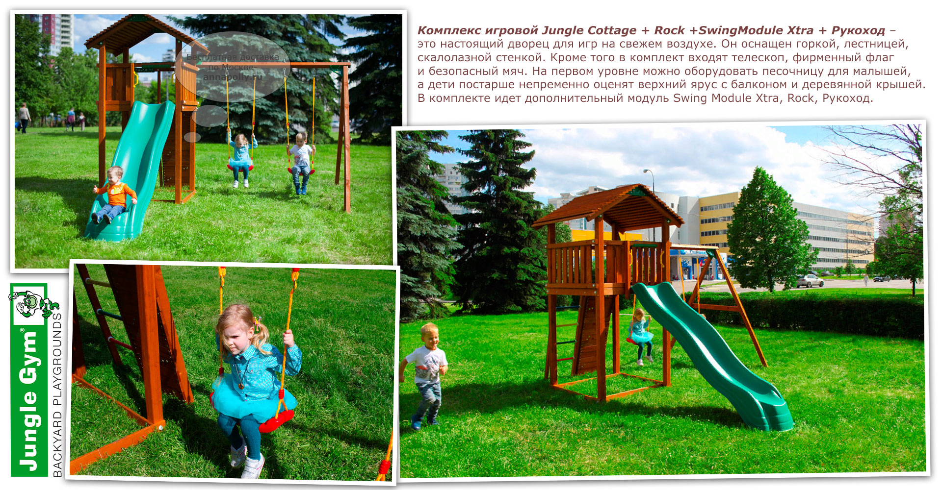 Комплекс игровой Jungle Cottage + Rock +SwingModule Xtra + РукоходJC3 – это настоящий дворец для игр на свежем воздухе. Он оснащен горкой, лестницей, скалолазной стенкой. Кроме того в комплект входят телескоп, фирменный флаг и безопасный мяч. На первом уровне можно оборудовать песочницу для малышей, а дети постарше непременно оценят верхний ярус с балконом и деревянной крышей. В комплекте идет дополнительный модуль Swing Module Xtra, Rock, Рукоход.