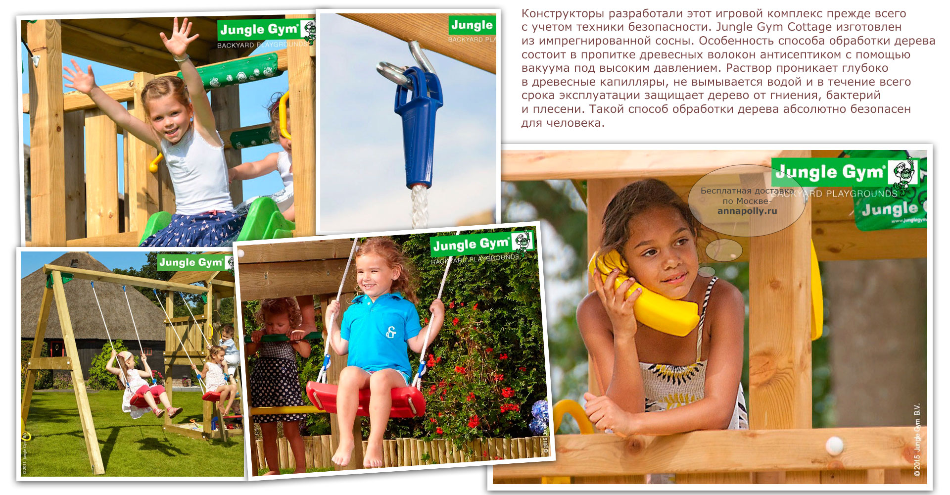 Конструкторы разработали этот игровой комплекс прежде всего с учетом техники безопасности. Jungle Gym Cottage изготовлен из импрегнированной сосны. Особенность способа обработки дерева состоит в пропитке древесных волокон антисептиком с помощью вакуума под высоким давлением. Раствор проникает глубоко в древесные капилляры, не вымывается водой и в течение всего срока эксплуатации защищает дерево от гниения, бактерий и плесени. Такой способ обработки дерева абсолютно безопасен для человека.