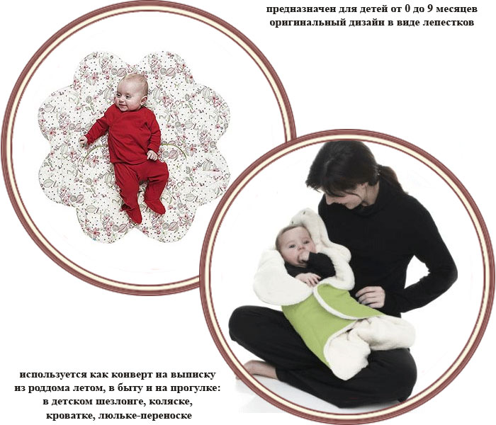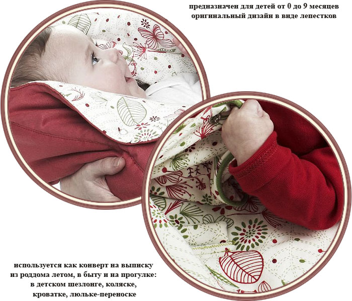Используется как конверт на выписку из роддома летом, в быту и на прогулке: в детском шезлонге, коляске, кроватке, люльке-переноске