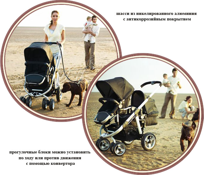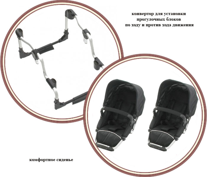 Люлька (2 шт.), прогулочный блок (2 шт.), шасси, дождевик (2 шт.), конвертор, корзина для покупок
