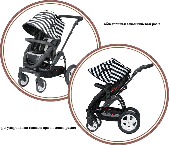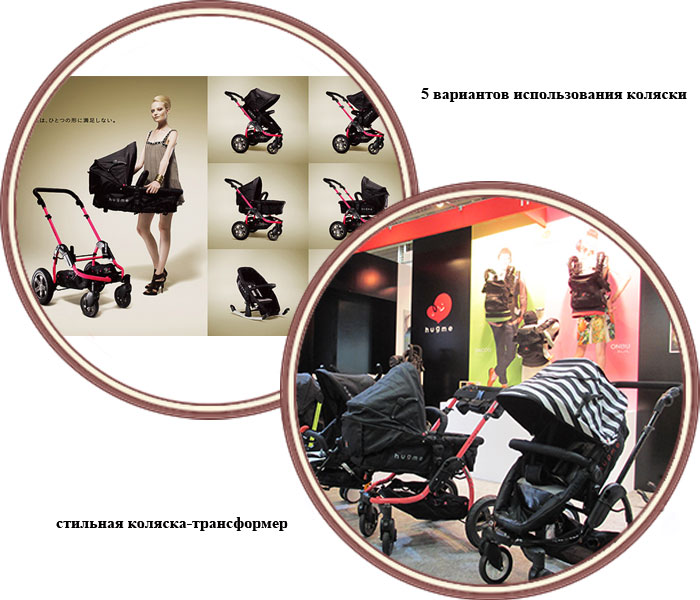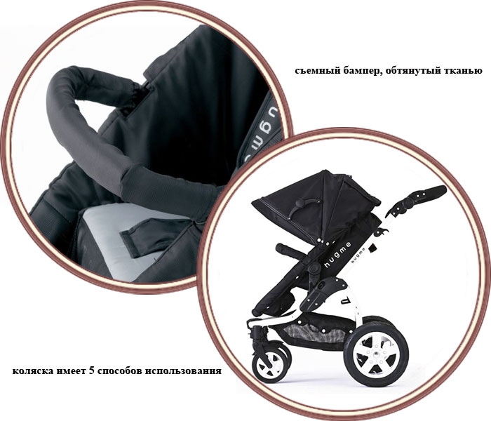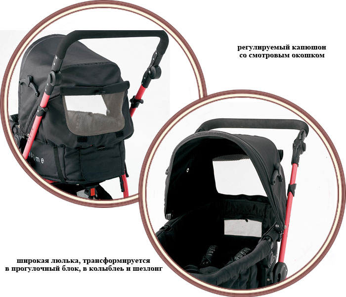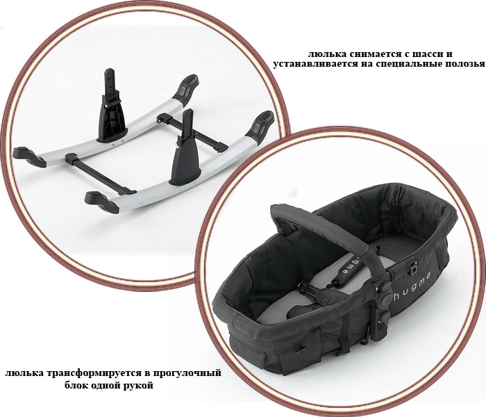 5 вариантов: люлька для новорожденного (устанавливается по/против хода движения), прогулочная коляска (люлька трансформируется в прогулочный блок одной рукой), колыбель для новорожденного (люлька снимается с шасси и устанавливается на специальные полозья, которые идут в комплекте с коляской), кресло-качалка для подросшего малыша, шезлонг (люльку можно установить на специальные полозья)