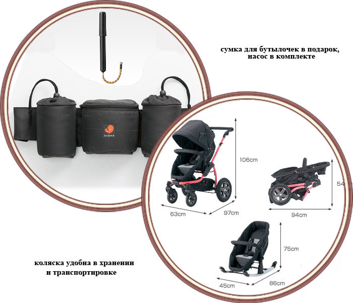 Коляска-трансформер, база для колыбельки и кресла-качалки, внутренний матрасик, чехол для ног, насос, сумка-переноска (в подарок), сумка для бутылочек (в подарок)