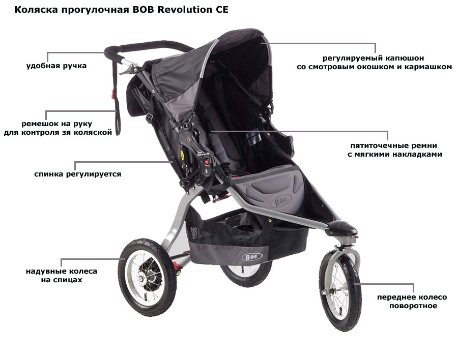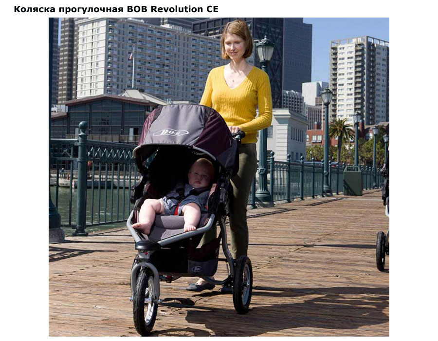 Коляска прогулочная BOB Revolution CE – трехколесная американская коляска на больших надувных колесах и высокотехнологичными элементами подвески для мягкой езды. С таким «внедорожником» легко отправлять на прогулку по любым дорогам. Широкое сиденье оборудовано внутренними ремнями, спинка регулируется по наклону, капор оснащен смотровым окошком, а на спинке сзади имеется вместительный карман для мелочей. Поставить коляску на «парковку» позволит надежный тормоз на оба задних колеса. В целях недопущения потери контроля над коляской, в комплект входит специальный ремешок на руку.