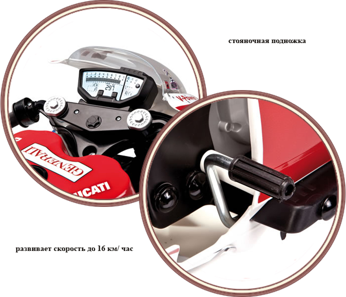 Электромотоцикл Peg-Perego Ducati GP 24V – по-настоящему порадует Вашего маленького гонщика. На нем можно ездить по твердым и ровным площадкам и тротуарам с максимальным углом возвышения 17 градусов. В линейке производителя это самый быстрый и супермощный электромотоцикл. Управляя электромотоциклом, малыш развивает координацию движений и получает первые навыки вождения.