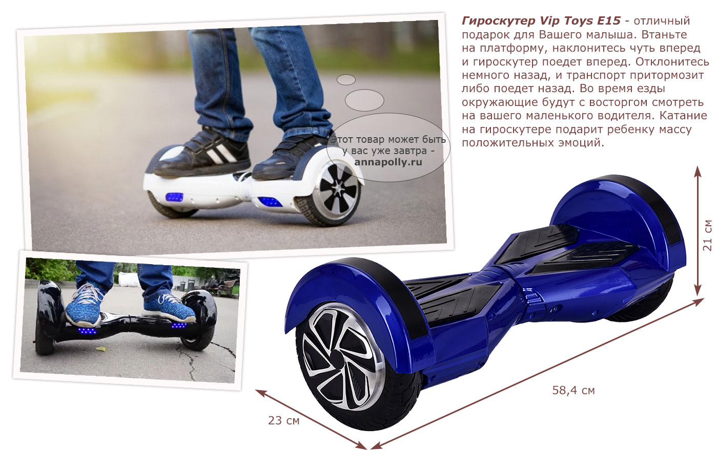 Гироскутер Vip Toys E15 - отличный подарок для Вашего малыша. Втаньте на платформу, наклонитесь чуть вперед и гироскутер поедет вперед. Отклонитесь немного назад, и транспорт притормозит либо поедет назад. Во время езды окружающие будут с восторгом смотреть на вашего маленького водителя. Катание на гироскутере подарит ребенку массу положительных эмоций.